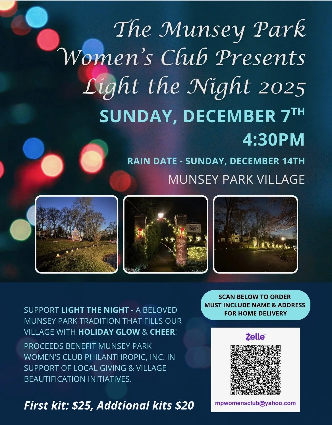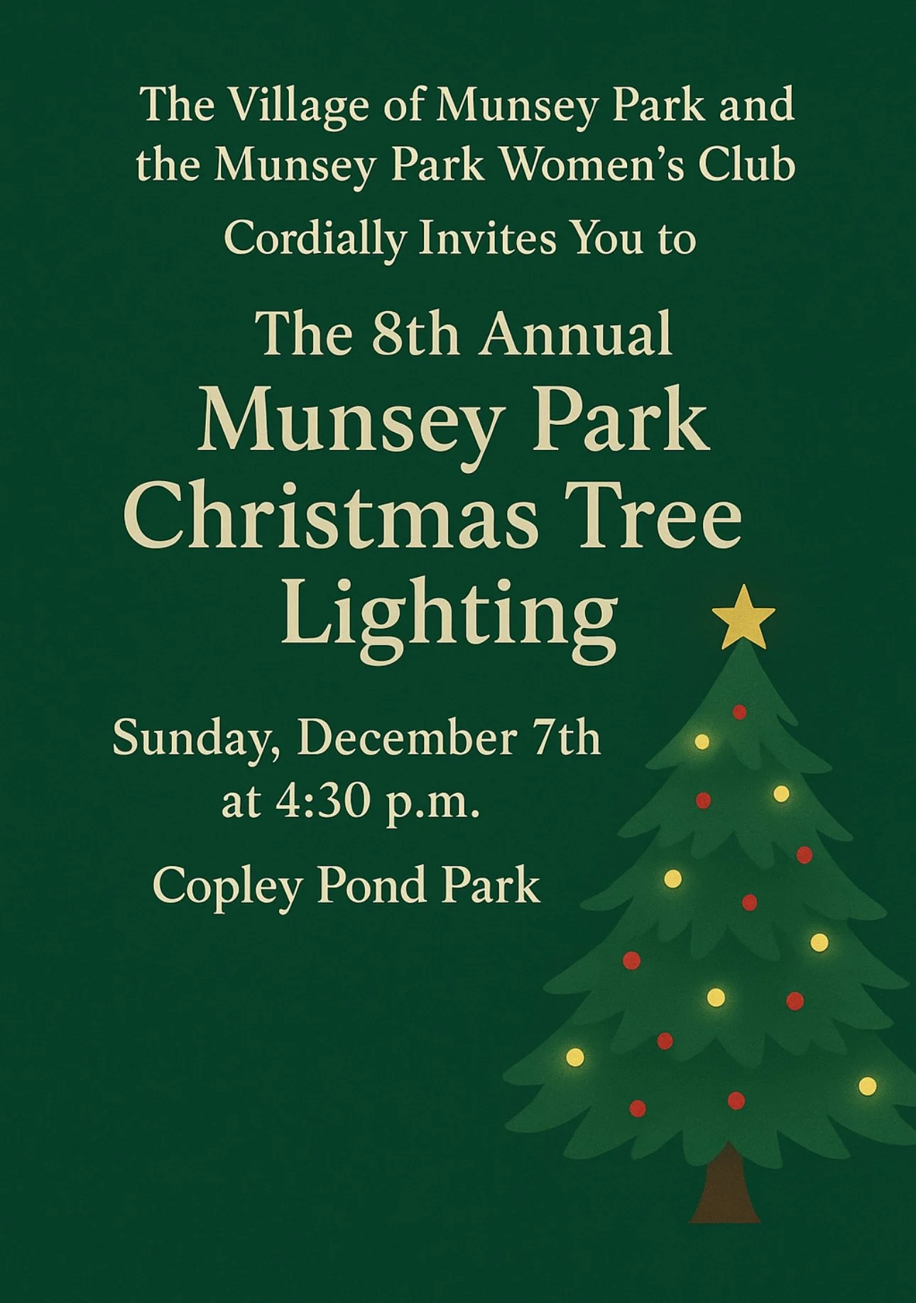 The Village of Munsey Park and the Munsey Park Women's Club cordially invite you to the Annual Christmas Tree Lighting and the MPWC's beloved tradition of Light the Night, December 7th at 4:30 p.m. in Copley Pond Park. The tree lighting and a visit by a special guest will occur RAIN or SHINE promptly at 5:00 p.m. In the event of inclement weather, however, Light the Night will occur on Sunday, December 14th at 4:30 p.m.